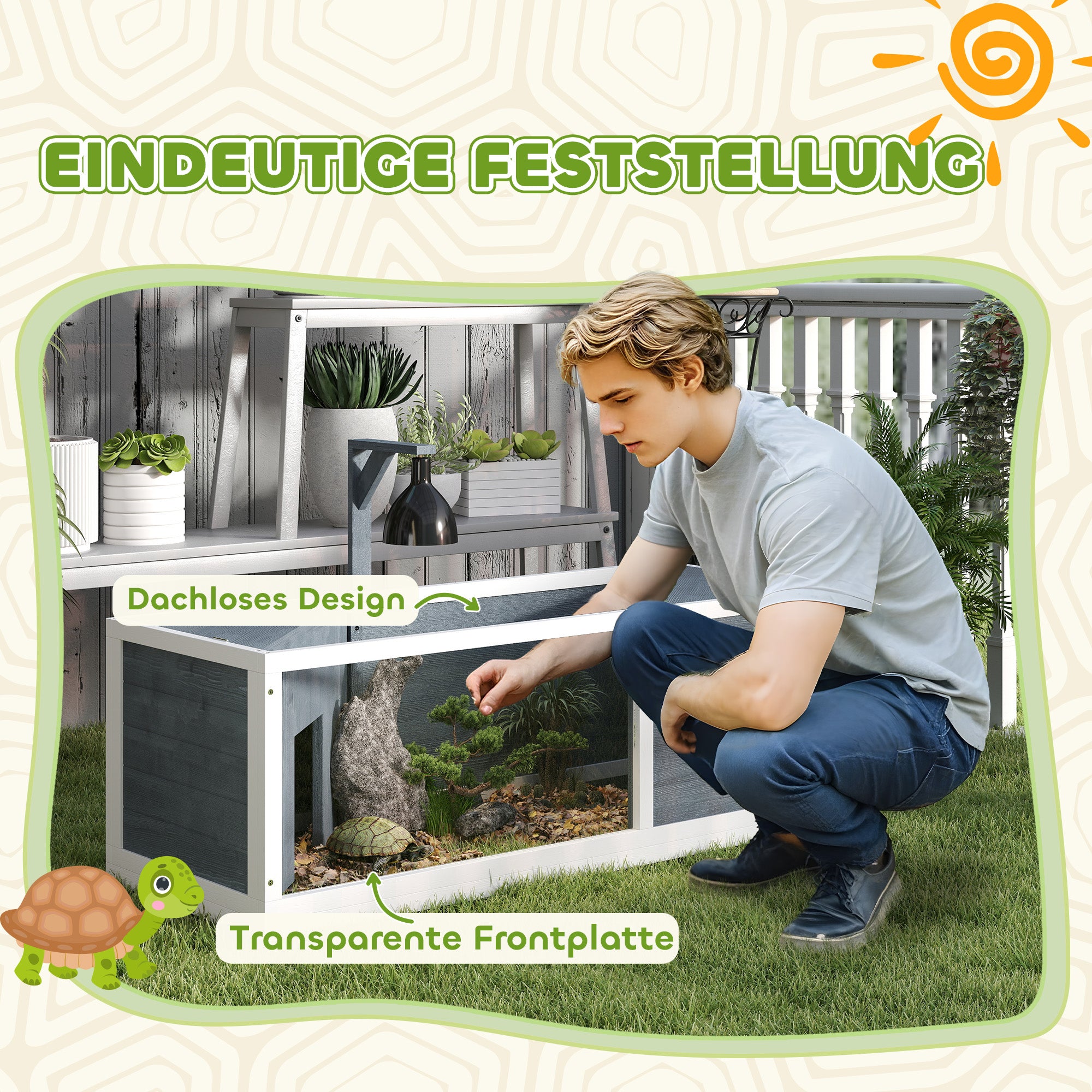 Find det ideelle hjem til din skildpadde med PawHut Skildpaddehuset. Den omfatter to primære indkvarteringsmuligheder og et midterområde til leg. Takket være den gennemsigtige front og den hængslede top på skildpaddeindhegningen kan du nemt observere dit kæledyr og interagere med det, som du ønsker. Den nemme rengøring og det robuste, vejrbestandige fyrretræ gør vedligeholdelsen til en leg.