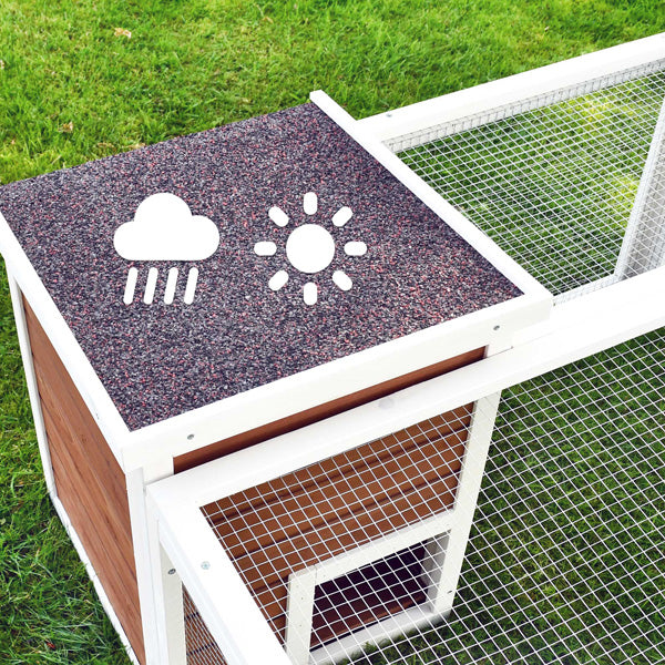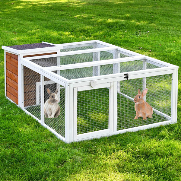- Mål: Med en samlet længde på 128 cm, en bredde på 100 cm og en højde på 46,5 cm giver Rabbit Run tilstrækkelig plads til, at dyrene kan bevæge sig frit. Huset er 38 cm bredt, 40 cm dybt og 54 cm højt.