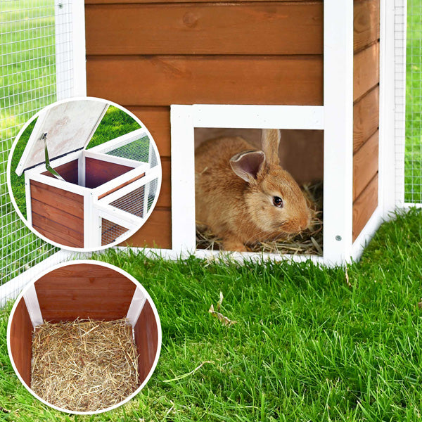 - Sikker og tilgængelig: Trådnettet beskytter dyrene mod at løbe væk og giver samtidig beskyttelse mod mulige farer. Med tre adgangsmuligheder – en klap på toppen og to andre åbninger på siderne – er indhegningen nem at komme til, hvilket gør det lettere at tage dyrene ud og give dem mad og vand. Derudover kan taget på huset åbnes, så det kan rengøres grundigt.