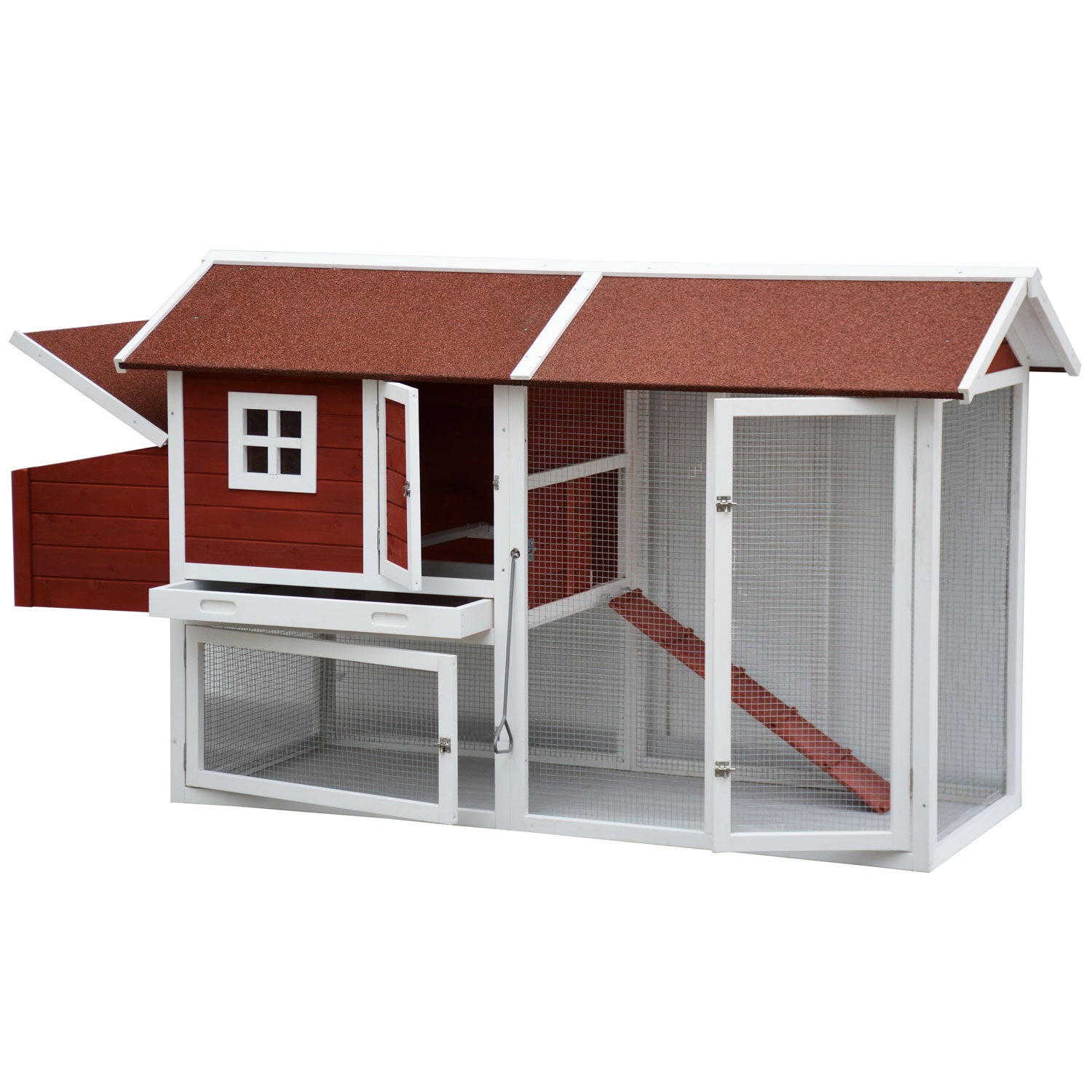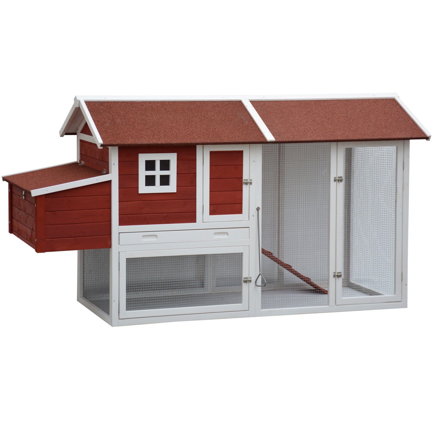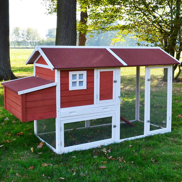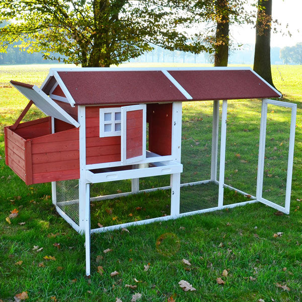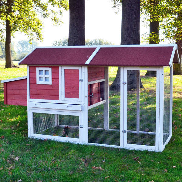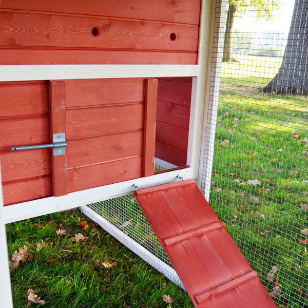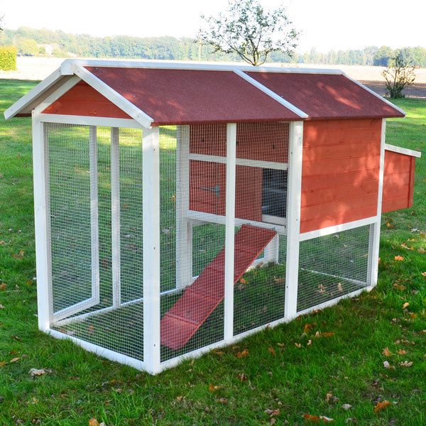 Den komplette nederste og højre del tjener som en hønsegård, hvor dine kyllinger kan ridse, plukke, gå og slappe af i solen. Den hyggelige hønsegård er tilgængeligt via en rampe, men kan også lukkes med en skydedør udefra.