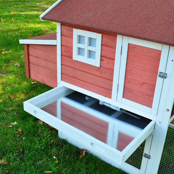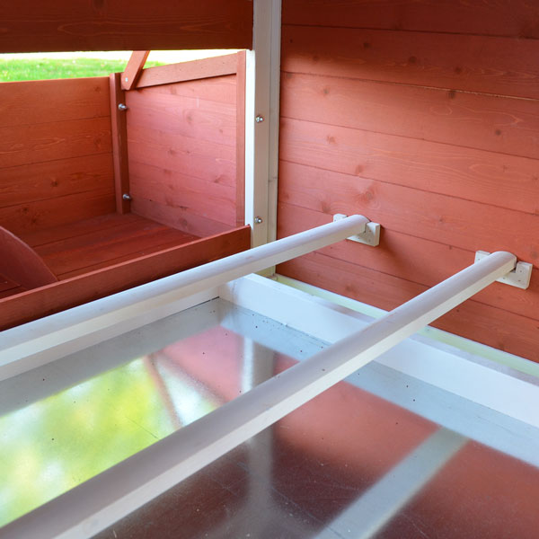 Under hønsehuset er der en gødningsskuffe. Den kan nemt og bekvemt fjernes og tømmes til rengøring. To siddestænger giver et behageligt sted for dine kyllinger, og ekskrementerne falder ned i gødningsskuffen.