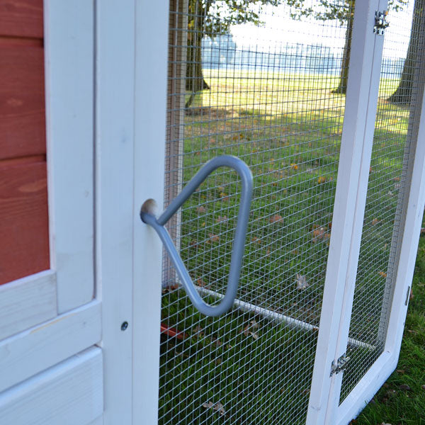 Hønsehuset har en smuk dør med et gittervindue, hvorigennem du kan få fat i dine kyllinger eller rense interiøret. Desuden har hønsehuset et ventilationshul på siden, som kan lukkes ved køligere temperaturer.