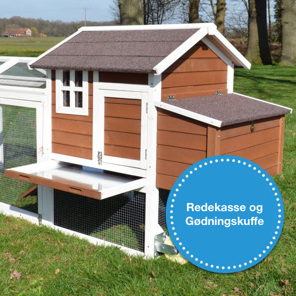 Dine kyllinger er lækre anbragt i et rigtig flot hus med 2 siddepinde og en separat redekasse. Redekassen har et hængslet låg. Dette gør det særligt nemt for dig at fjerne æggene udefra. En rampe fører til det udvendige område. Om nødvendigt kan indgangen låses udefra, og kyllingerne kan kun bevæge sig i hønsehuset eller i det udendørs kabinet. En gødningsskuffe giver dig mulighed for at rengøre stalden meget hurtigt og nemt. Det udendørs kabinet har en stor dør, hvorigennem du kan lade kyllingerne strejfe længere.
