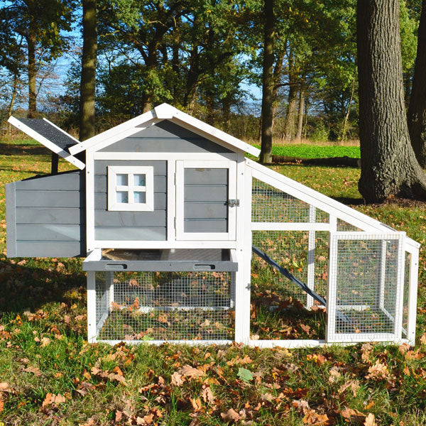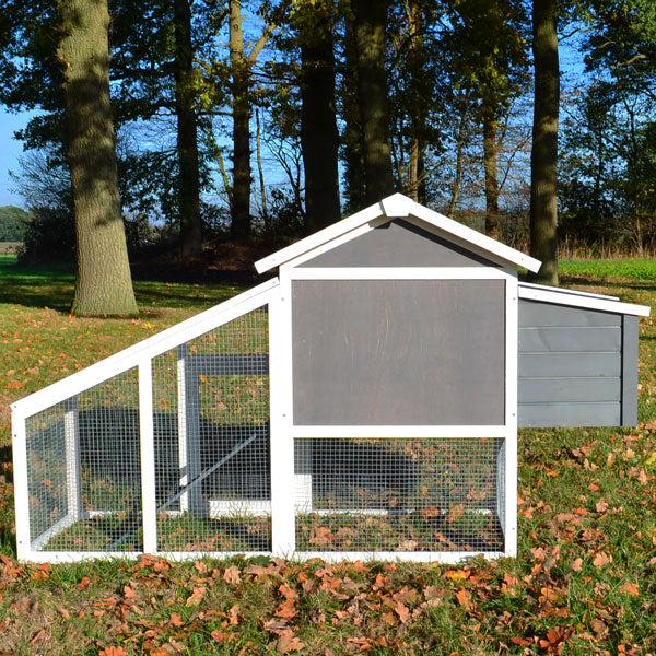 Smukt, to-farvet hønsehus med sidde-pind, redekasse med åbneligt tag, udtrækkelig rengøringsskuffe og et robust udeareal – alt hvad dine høns behøver.
