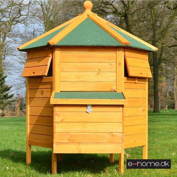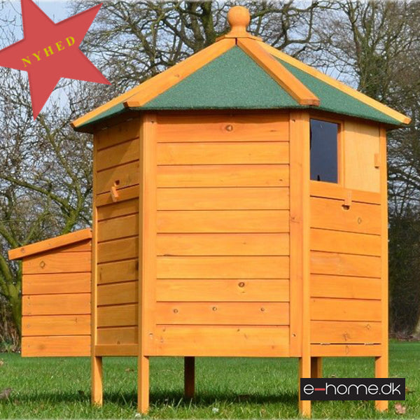 Dette 6-kantede hønsehus er både smukt og iøjnefaldende. HØNSEHUS MODEL Pavillon er beregnet til fritgående høns, eller til placering i en større hønsegård.