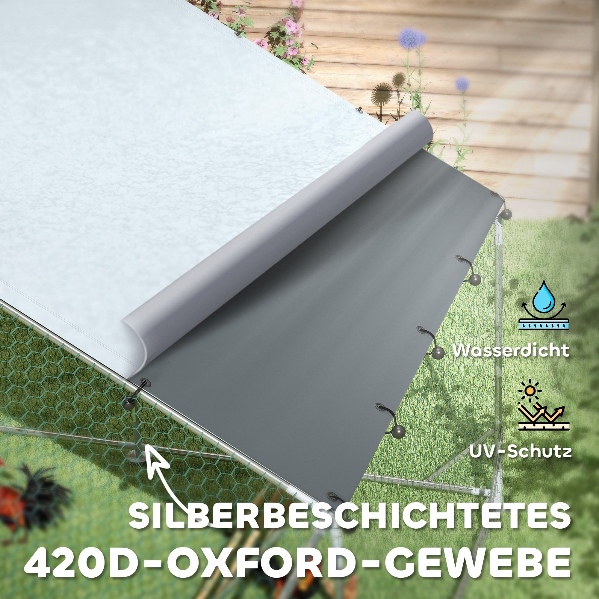 - ✔ Galvaniseret stål og plastbelagt net i hønsehuset sikrer lang levetid