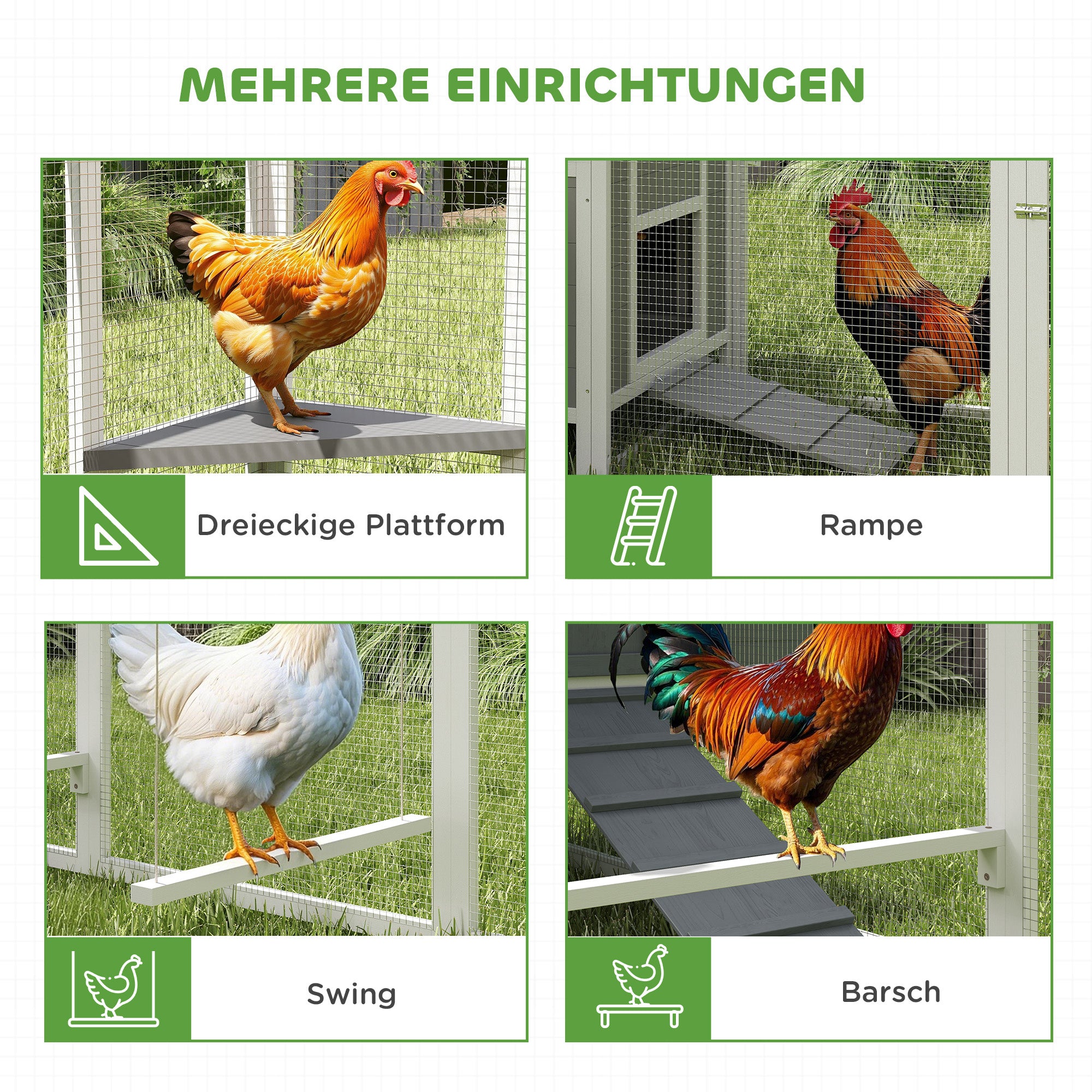 • Sjovt og aktivt design: Dette hønsehus til små dyr er udstyret med en gynge, en siddepind, en rampe og en trekantet platform, der giver masser af underholdning og aktivitet for at holde dine kyllinger i form og glade.