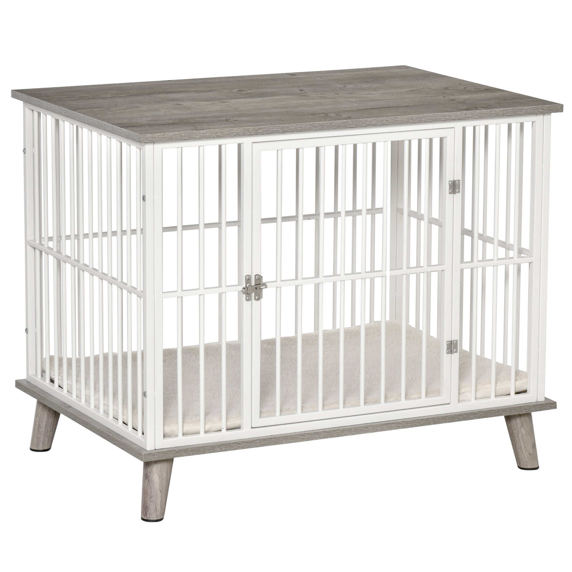 Hundebur med trælook og bordplade samt hynde til mellemstore hunde, 86x60x70cm, hvid og grå