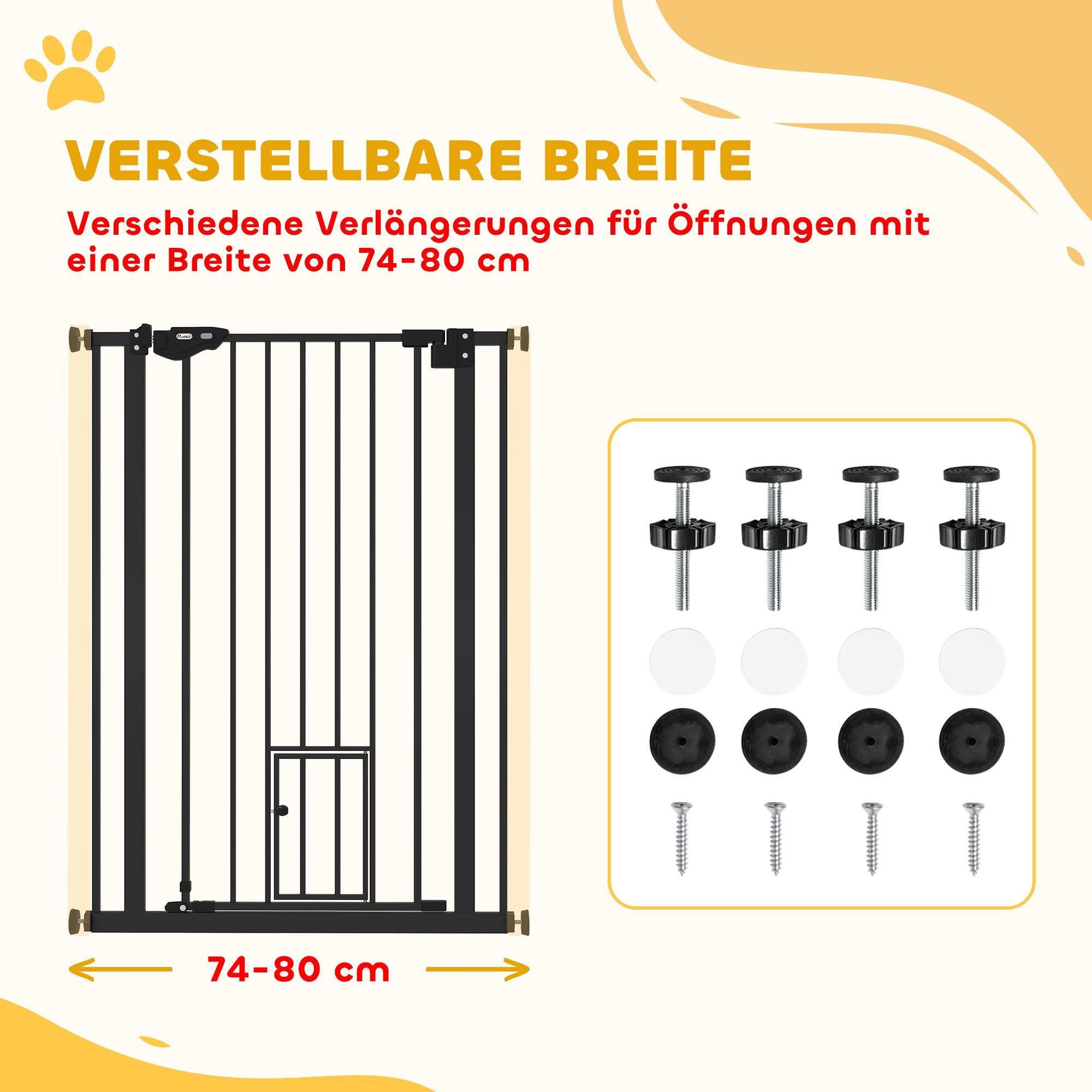 Hold nemt dine kæledyr væk fra bestemte områder med PawHut hundegitteret. Det er lavet af massivt stål og tilbyder maksimal stabilitet og holdbarhed. Takket være de fire justerbare skruer kan det fleksibelt justeres til bredder fra 74 cm til 80 cm, hvilket gør det perfekt til en række forskellige rumstørrelser. Sørg for sikkerhed og orden i dit hjem – enkelt og effektivt.