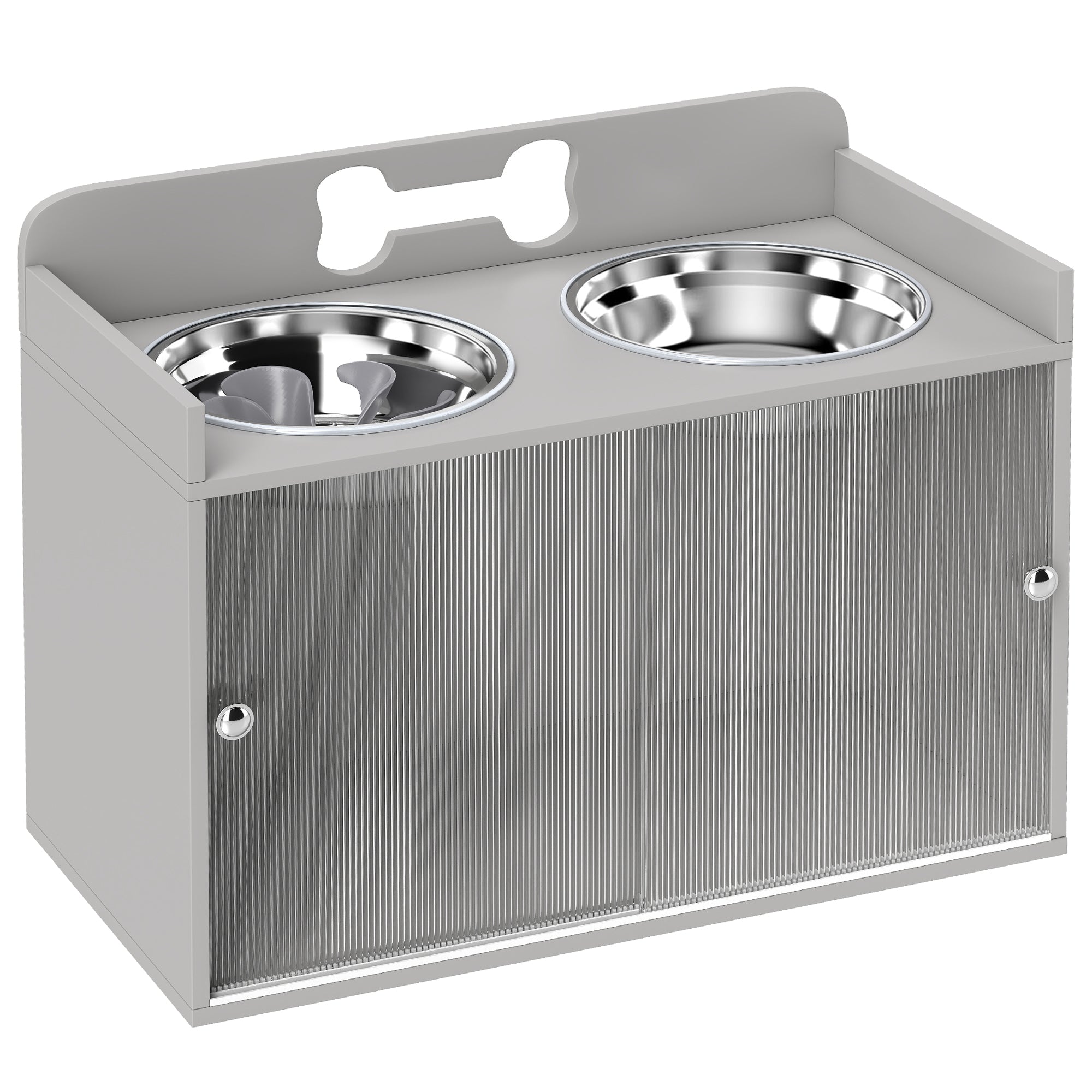 Hævet foderstation med 2 skåle og skab, MDF, rustfrit stål, knoglemønster, grå