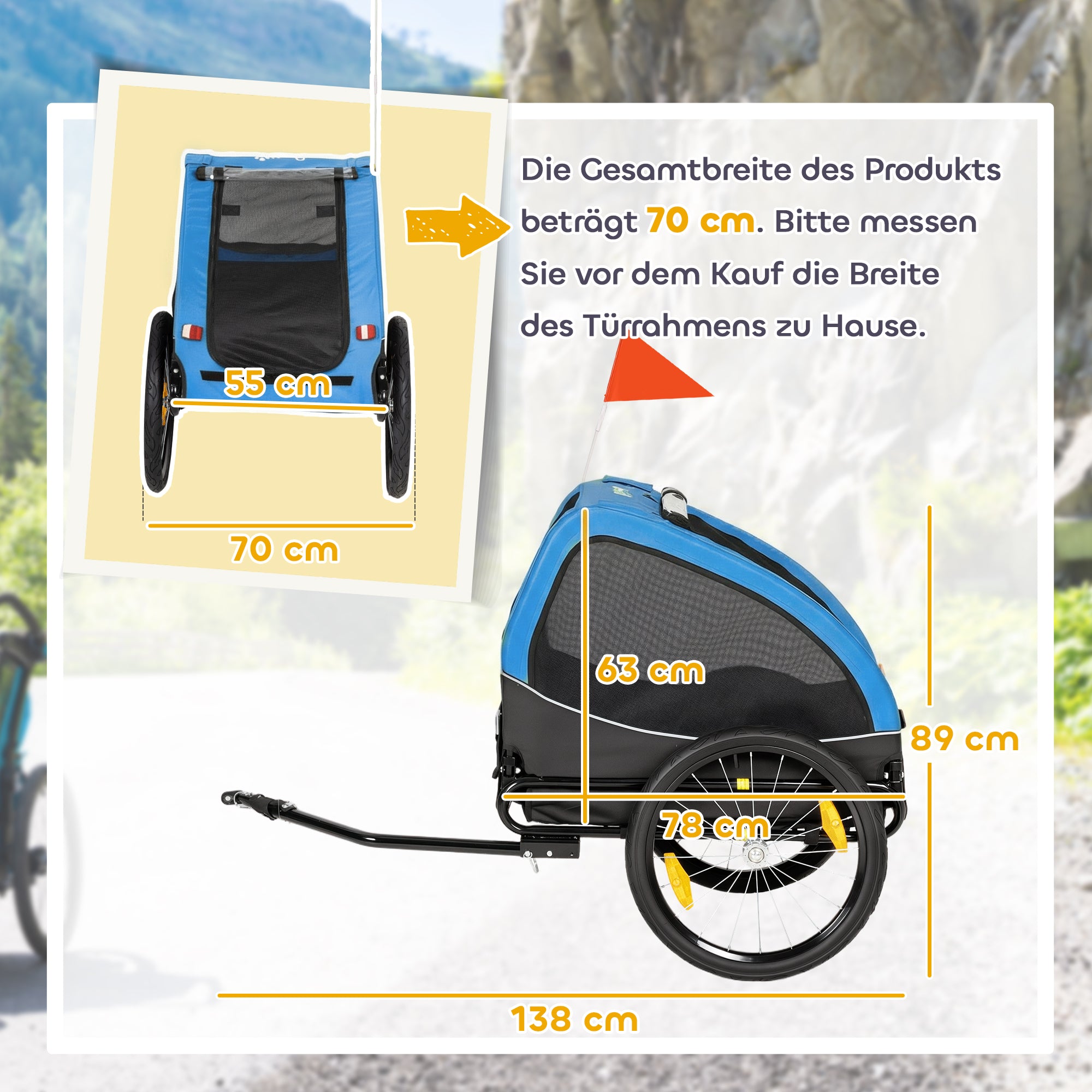 Sammenklappelig hundetrailer med reflekser, netvindue, hjul, dør, sikkerhedsflag til hunde op til 20 kg, 138x70x89 cm, blå