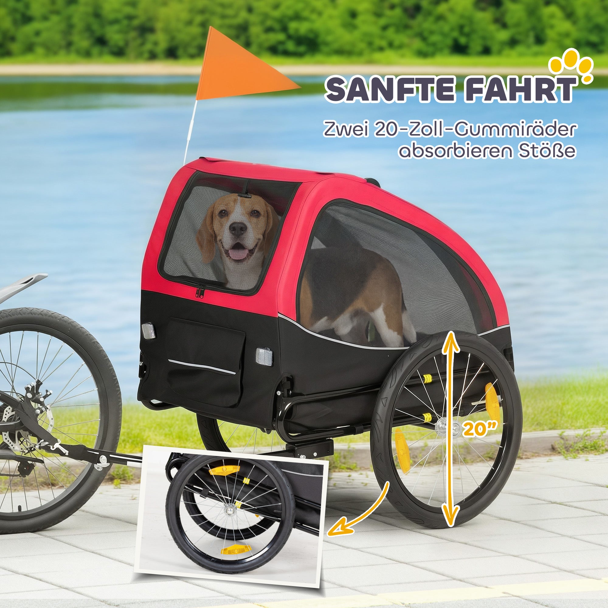 Komfort i alle terræner: De to 20" gummihjul på denne hundecykeltrailer absorberer effektivt stød og sikrer en jævn og behagelig kørsel. Uanset om det er på byens gader eller i parker, vil dit kæledyr – især ældre hunde – nyde en afslappet og behagelig rejse.