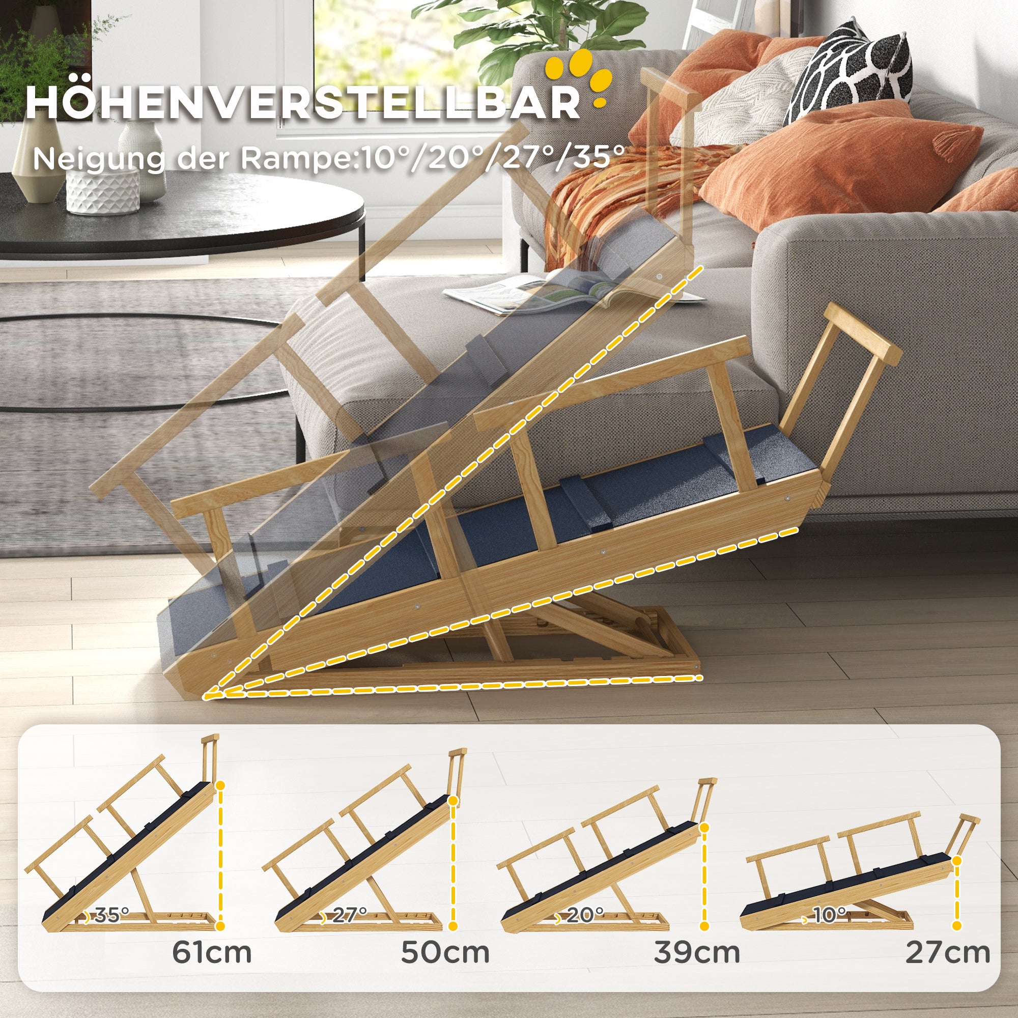 Gør din firbenede vens liv lettere med PawHut hunderampen! Dette klatreredskab i fyrretræ kan rumme store hunde og er ideelt til ældre eller bevægelseshæmmede kæledyr. Med fire justerbare højder fra 27 cm til 61 cm passer den perfekt ved siden af senge, sofaer og andre områder. Kæledyrsrampen er også foldbar og udstyret med skridsikre måtter og gelændere for ekstra sikkerhed. Ideel til hunde og katte!