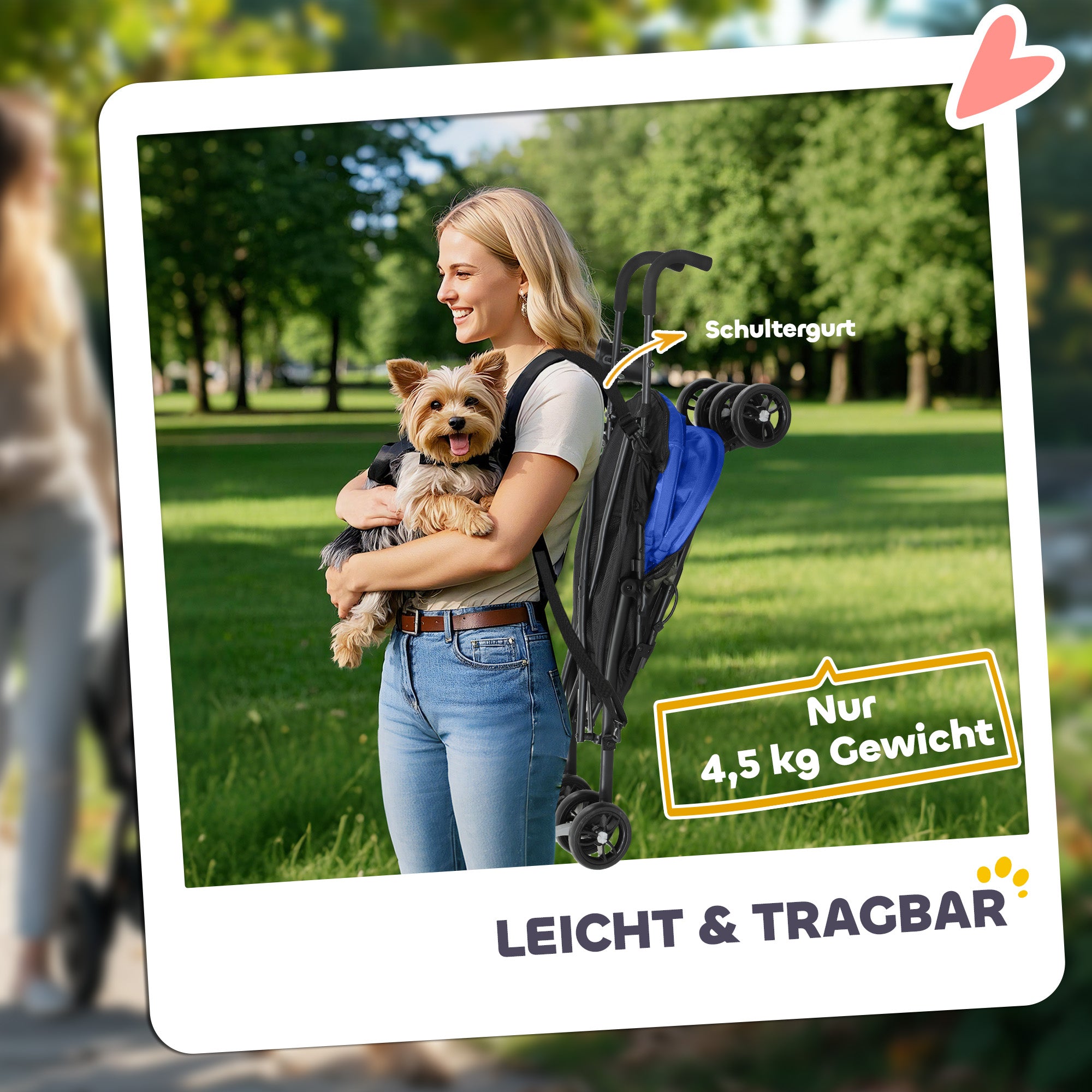 Hundeklapvogn, Sammenklappelig Hundeklapvogn til Hunde og Katte op til 4 kg, Katteklapvogn med Netvinduer, Skulderrem, Opbevaringspose, Kopholder, Paraply, Katteklapvogn, Mørkeblå