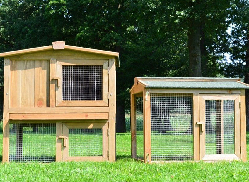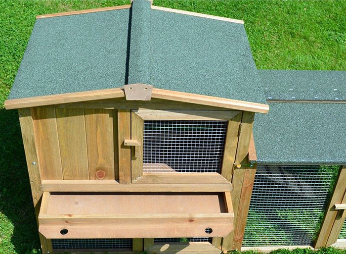 Det store beboelses bur på overetagen giver god plads, og der er let adgang både igennem taget der kan åbnes og de 2 store låger på fronten. Adgangen imellem etagerne kan lukkes med en låge. Taget er med fald til siderne og hver side af taget kan åbnes seperat. Taget er beklædt med grønt vandafvisende tagpap. Overetagen er delt i 2 afdelinger. Venstre side er en separat sove- og redeplads, der er omkranset med træ og adskilt af en lille væg således at sove- og redeområdet er mørkt og simulerer et hyggeligt kaninhul. På højre side et lidt større område med åben front, forsynet med et kraftigt galvaniseret net. Her får dyrene frisk luft og kan nyde en lur i solen. Det galvaniserede net kan anbringes drikkeflaske og foder skål. Husk at sørge for at der altid er frisk vand til dine dyr.