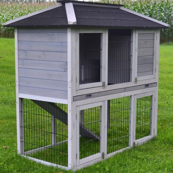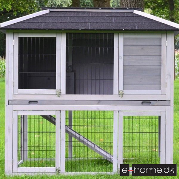 Den toetager store kaninbur "Villa" kombinerer moderne design med dyrevelfærd og bliver et rigtigt blikfang i enhver have. Det moderne kaninbur er malet i 2 grå nuancer og sort tag af tagpap gør den perfekt til udendørs brug.