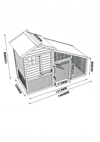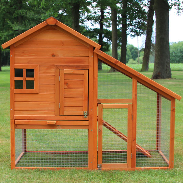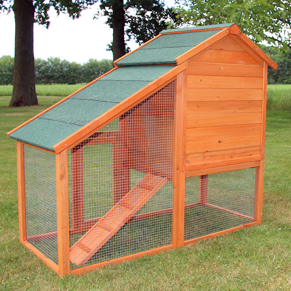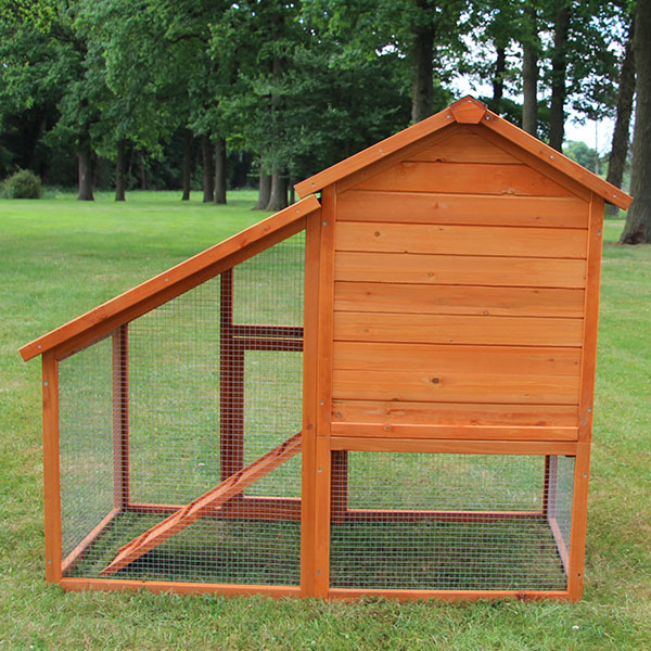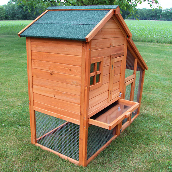Dette kaninbur er lavet af massivt fyrretræ som er behandlet med vejrbestandig maling. Den lysebrune "bondegård" har et grønt tag lavet af vandafvisende tagpap. Det monterede net er kraftigt og galvaniseret.