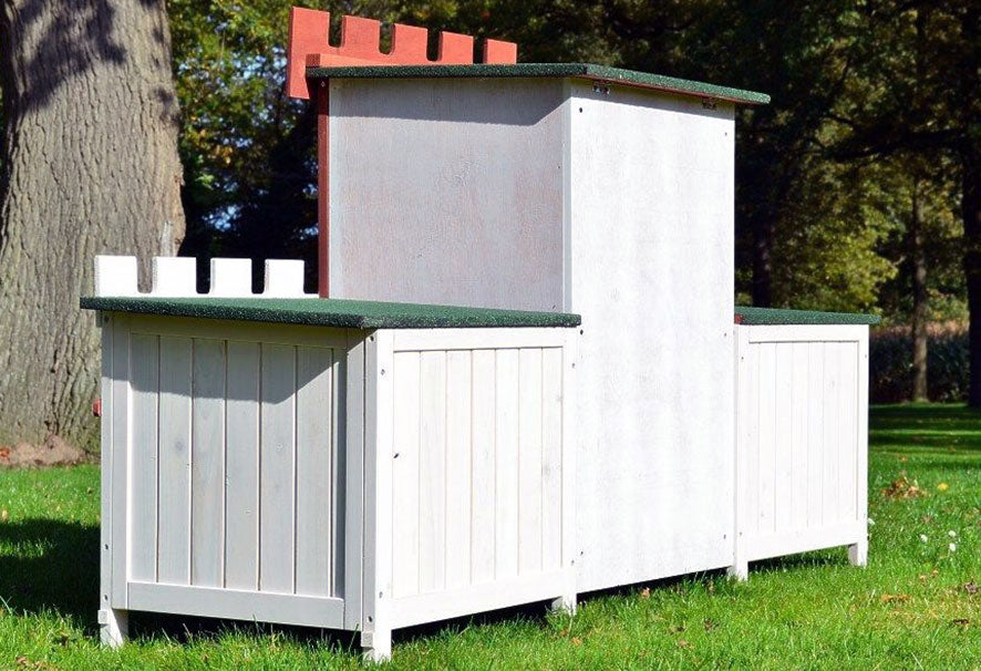 Borgens tage er dækket af vandafvisende tagpap. Tårnet kan åbnes, er et passende opbevaringssted for affald og mad! Opbevaringsrummet har en højde på ca. 32 cm.
