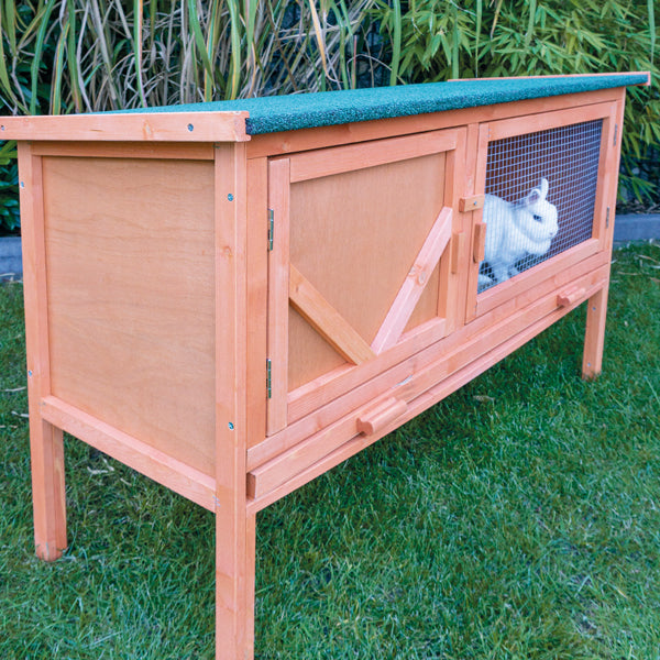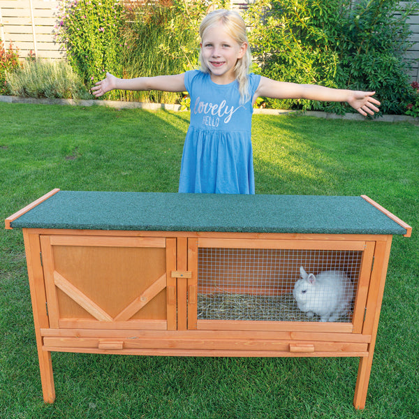 Stort Kaninbur i traditionel design, med god plads både inde og ude, og let adgang både igennem taget der kan åbnes og de 2 store låger på fronten. På venstre side er der en separat sove- og redeplads, der er omkranset med træ og på højre side det lidt større område med åben front, forsynet med et kraftigt galvaniseret net. Her får dyrene frisk luft og kan nyde en lur i solen. Sove- og redeområdet er mørkt og simulerer et hyggeligt kaninhul. Gulvet i hele buret er lavet som en skuffe der kan trækkes ud og bogstavrensningen. I det galvaniserede net kan anbringes drikkeflaske og foder skål. Husk at sørge for at der altid er frisk vand til dine dyr. Dette stabile kaninbur på træfødder for bedre luftcirkulation. Desuden er buret miljøvenlig og malet, og taget er beklædt med grøn vandafvisende tagpap. Taget kan åbnes for bedre adgang til øverste etage.