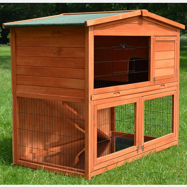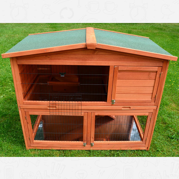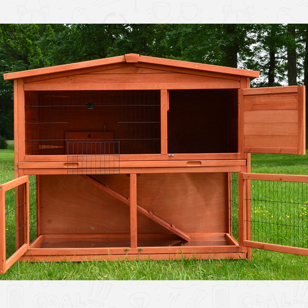 Det 2-etages kaninhus giver de søde gnavere en rummelig kælder med en indre rampe. Dyrene kan nemt komme fra kælderen til øverste etage og omvendt. Særligt praktisk er rampen der kan lukkes, så adgangen mellem de to etager kan låses.