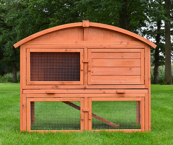 Den lysebrune kaninhus er også vejrbeskyttet og har et grønt, vandafvisende tagbeklædning. Dette beskytter desuden kaninhuset mod regn. Den robuste bagvæg sikrer optimal beskyttelse af dine dyr. Der er monteret en kraftig galvaniseret tråd på løbegården og på dørene.