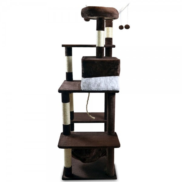 Kradstræ model Alice fås i 3 forskellige farver, så du har mulighed for at vælge din egen yndlingsfarve, eller farven der passer til omgivelserne der hvor den skal stå. Din kat vil føle sig superkomfortabel på den, da den har adskillige liggepladser, 3 sjove legekugler, der er beregnet til jagt og leg, og der er også et sisal-legetov over bundpladen, der giver mange gode timers underholding. Hængekøjen er et populært sted, hvor dine killinger kan slappe af og sove roligt i bløde materiale. Katte elsker huler, og kattehulen bliver din kats yndlingssted hvor han eller hun kan trække sig tilbage. De 7 sisal-søjler er velegnede til at hvæsse klør i.