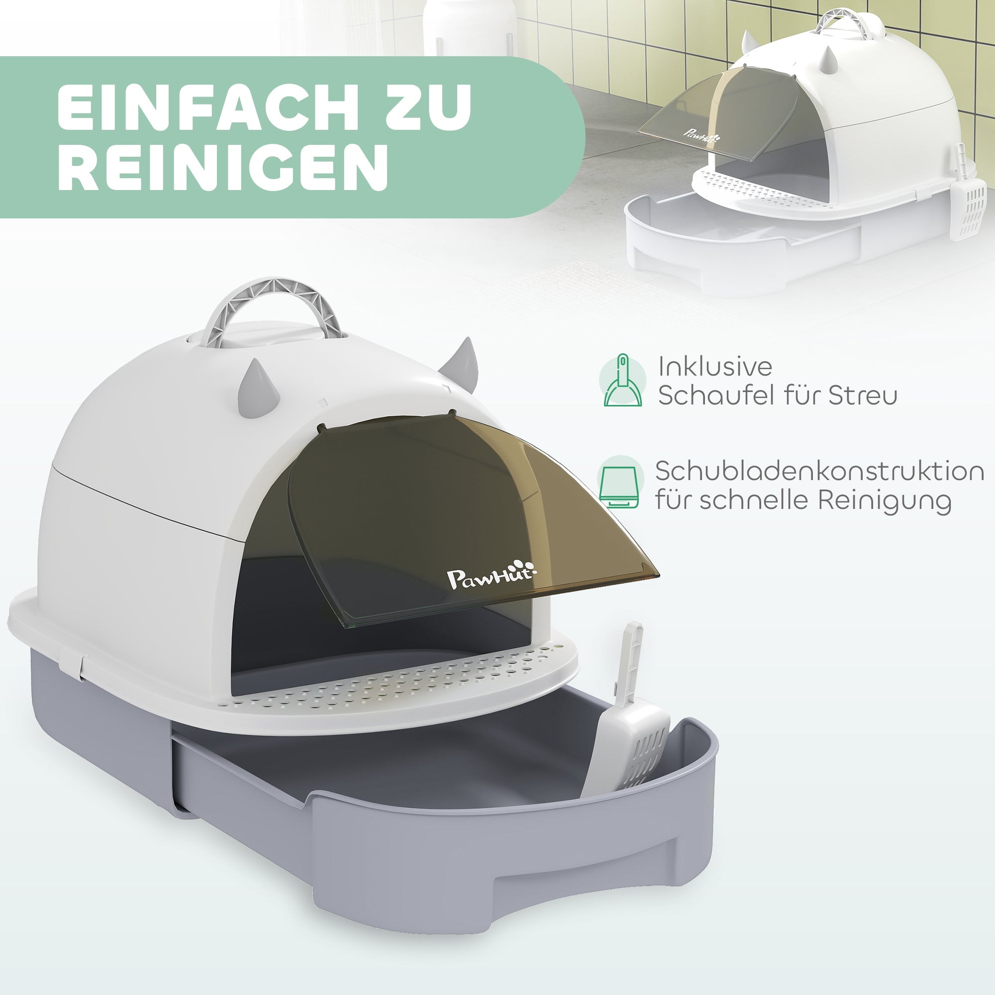 • Nem rengøring: Denne kattebakke med låg er udstyret med en bundskuffe og en kattebakke, der medfølger i leveringen, og den muliggør hurtig og nem rengøring.
