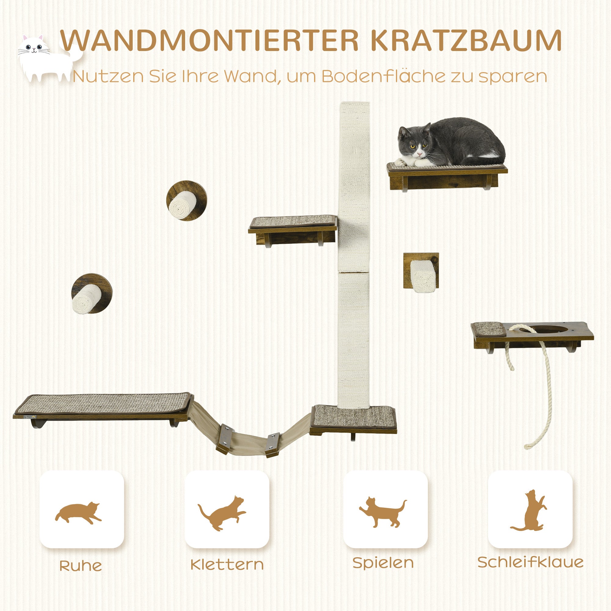 Klatrevægssæt til katte, 8-delt kattemøbel med kradsetræer, siddepinde, kradsebræt og sisal kattetrappe i brun til aktiv leg