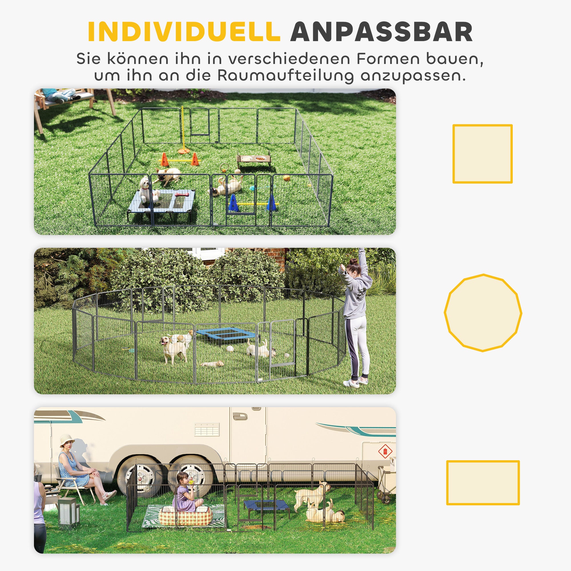 • Høj stabilitet: Skub jordpløkkerne ned i jorden for at fastgøre hvalpegården og sikkert holde små flugtkunstnere inde. Den er stor nok til små og mellemstore hunde med en skulderhøjde på op til 50 cm.