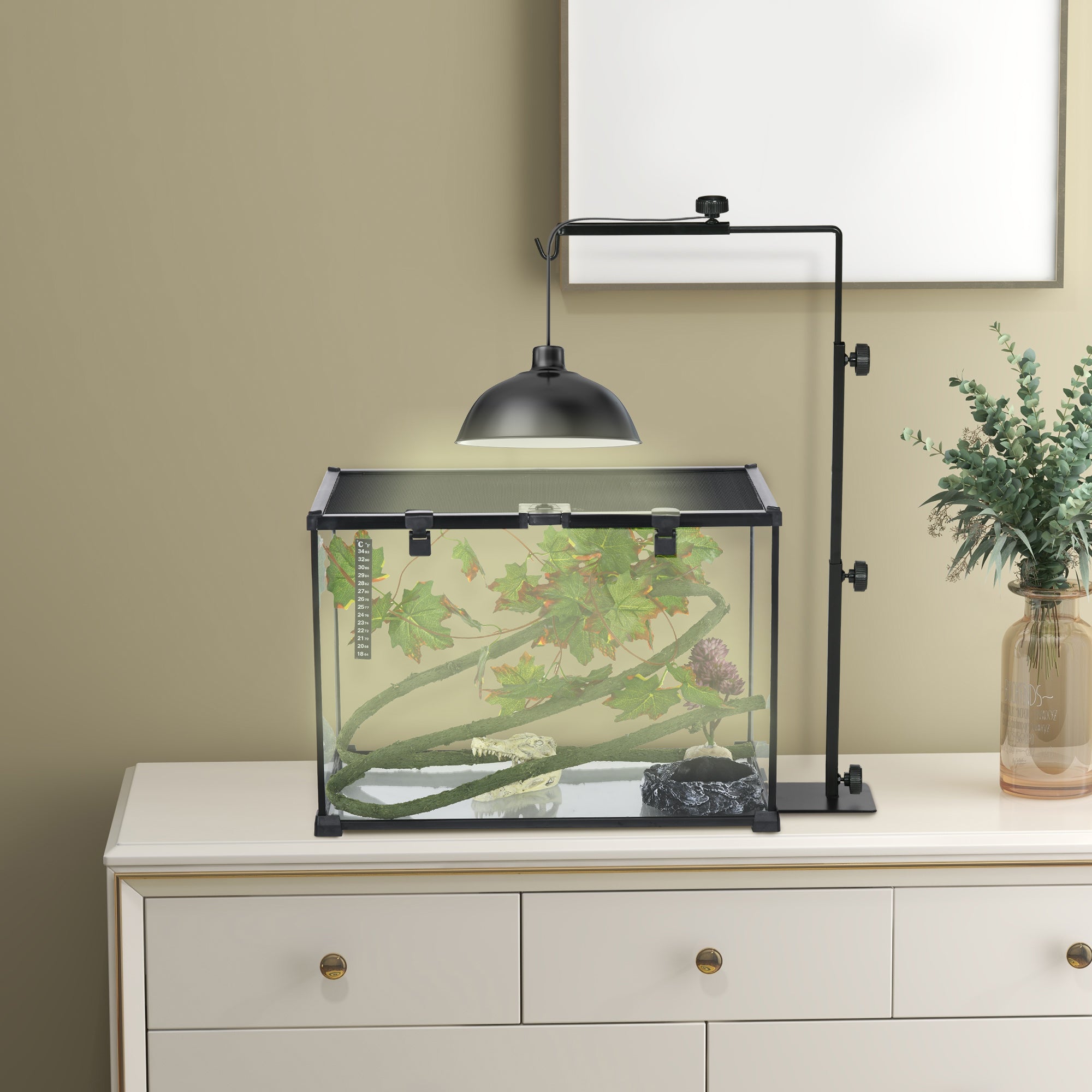 Opdag PawHut varmelampestativet, det ideelle tilbehør til dine koldblodede venner som firben og slanger. Takket være den justerbare højde (39-92 cm) og bredde (22-37 cm) tilpasser den sig forskellige opholdsrum. Den robuste stålbase og den praktiske stålkrog på krybdyrlampestativet gør det nemt at hænge en varmelampe op, så dit kæledyr altid har det varmt og behageligt. Et must for enhver padde- og krybdyrelsker!